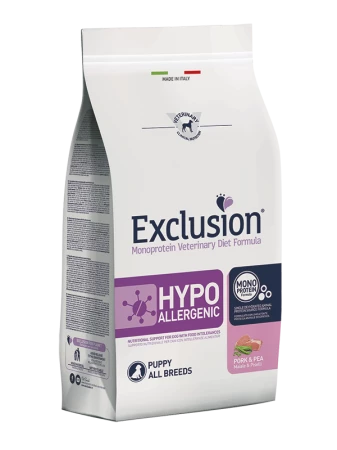 Caratteristiche: Exclusion Diet Hypoallergenic Pork and Pea Puppy All Breeds è un alimento completo dietetico per cuccioli formulato per la riduzione di intolleranze a ingredienti e a sostanze nutritive. Questo alimento completo dietetico possiede fonti selezionate di proteine e carboidrati.