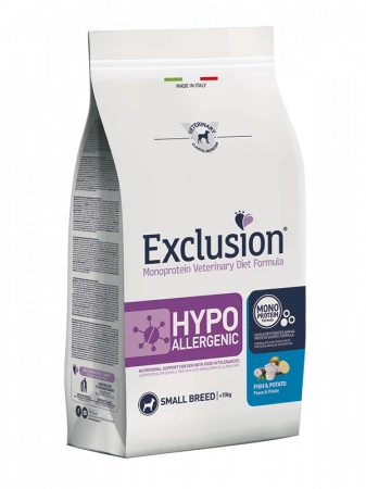 Caratteristiche: Exclusion Diet Hypoallergenic Fish and Potato Small Breed è un alimento completo dietetico per cani adulti formulato per la riduzione di intolleranze a ingredienti e a sostanze nutritive. Questo alimento completo dietetico possiede fonti selezionate di proteine e carboidrati.