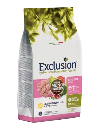 Exclusion Mediterraneo Monoprotein Formula – Noble Grain é un alimento completo e bilanciato formulato con una sola fonte proteica animale disidratata, per una ricetta chiara ed essenziale, e solo un cereale nobile di alta qualità. È preservato con antiossidanti naturali e integrato con Beta-glucani. È realizzato con una innovativa ricetta di Superfood della tradizione Mediterranea: Canapa, Olio d’Oliva, Pomodoro, Melagrana, Broccolo e Cicoria. Senza grasso di pollo, frumento, soia e mais aggiunti.